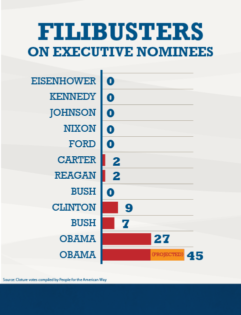 The need for change is obvious. In the history of the Republic, there have been 168 filibusters of executive and judicial nominations. Half of them have occurred during the Obama Administration – during the last four and a half years. These nominees deserve at least an up-or-down vote. But Republican filibusters deny them a fair vote and deny the President his team.
